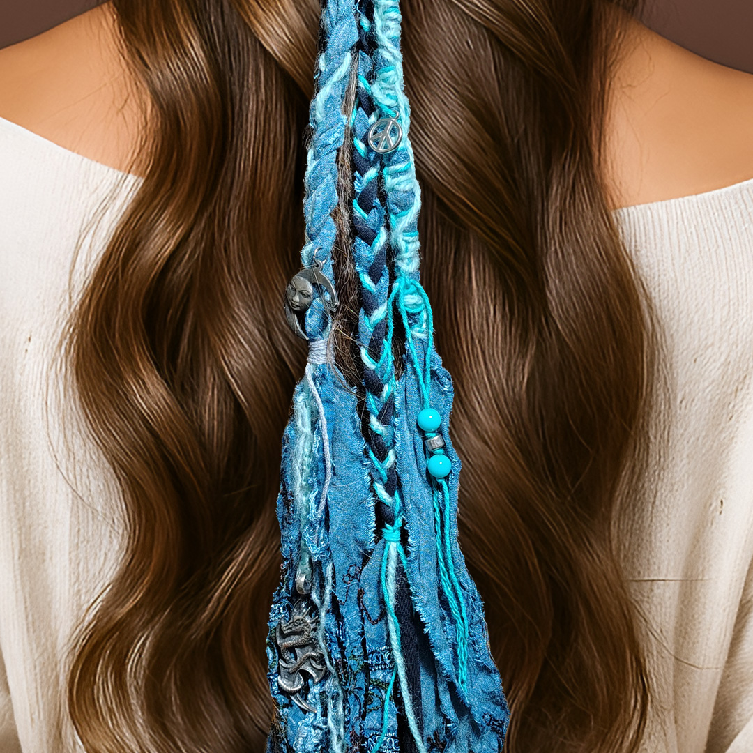 Este accesorio de cabello estilo rastra presenta un trenzado robusto y adornos que cuelgan libremente, como una luna de metal, un dije dragón tribal y varias cuentas en tonos turquesa y azul. La combinación de texturas, hilos sueltos y flecos de tela crea un efecto visual llamativo y despreocupado. Es ideal para festivales, conciertos, eventos casuales o simplemente para darle un toque diferente a tu look diario.