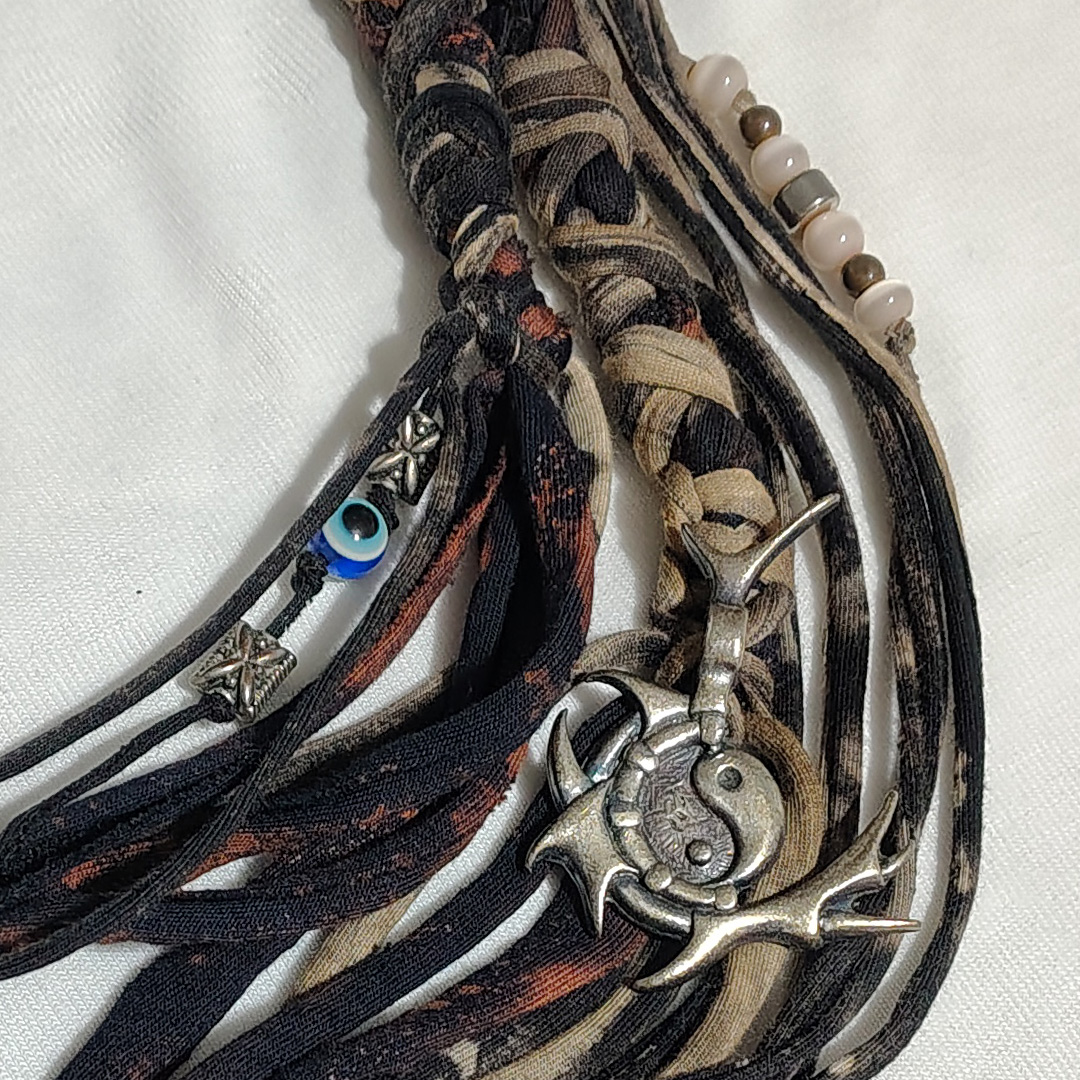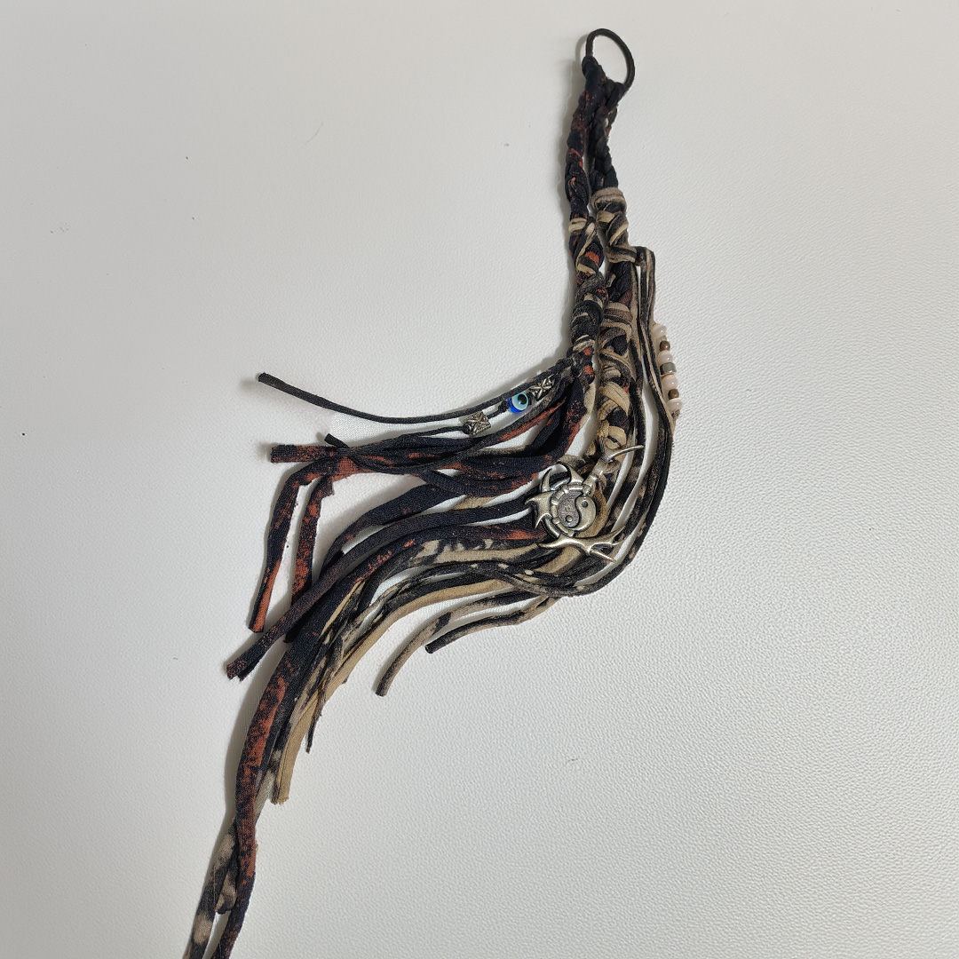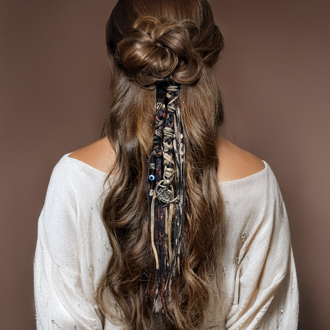 Dale a tu look un toque único y bohemio con este hair wrap artesanal. Confeccionado a mano con hilos y cintas, adornado con dijes y cuentas de la suerte, es el accesorio perfecto para expresar tu estilo libre y auténtico.